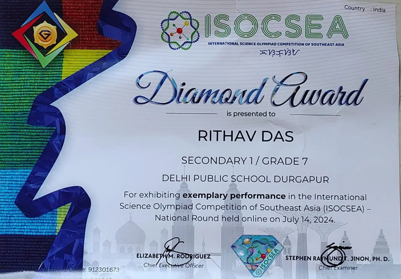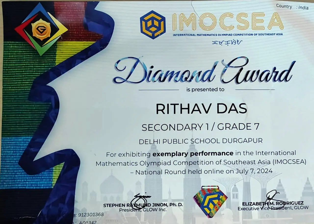 দিল্লি পাবলিক স্কুল দুর্গাপুর অত্যন্ত গর্বের সাথে জানাচ্ছে যে, ৮ম শ্রেণির ঋথভ দাস ইউনিফাইড ইন্টারন্যাশনাল ম্যাথমেটিক্স অলিম্পিয়াডে (UIMO) (২০২৪-২৫) জাতীয় স্তরে ১ম স্থান অর্জন করেছে!