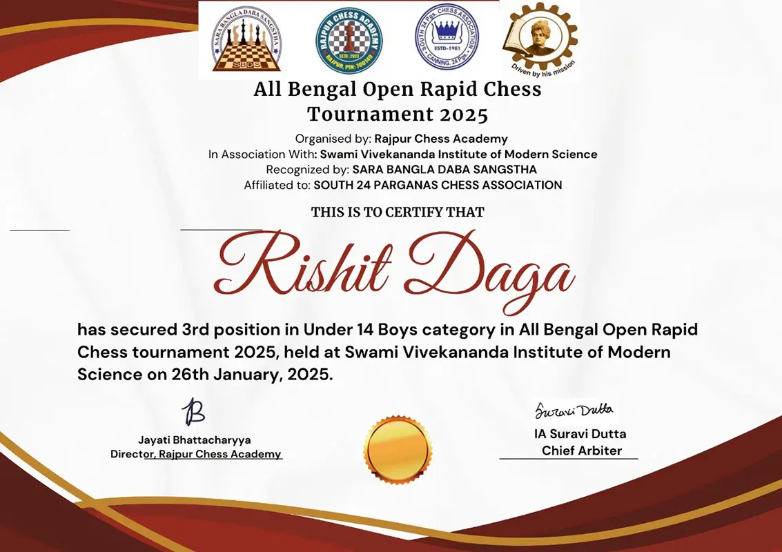 ঋষিত দাগা – খেলাধুলায় অসাধারণ প্রতিভার জন্য যোগ্যতার স্বীকৃতিপত্র (দাবা)