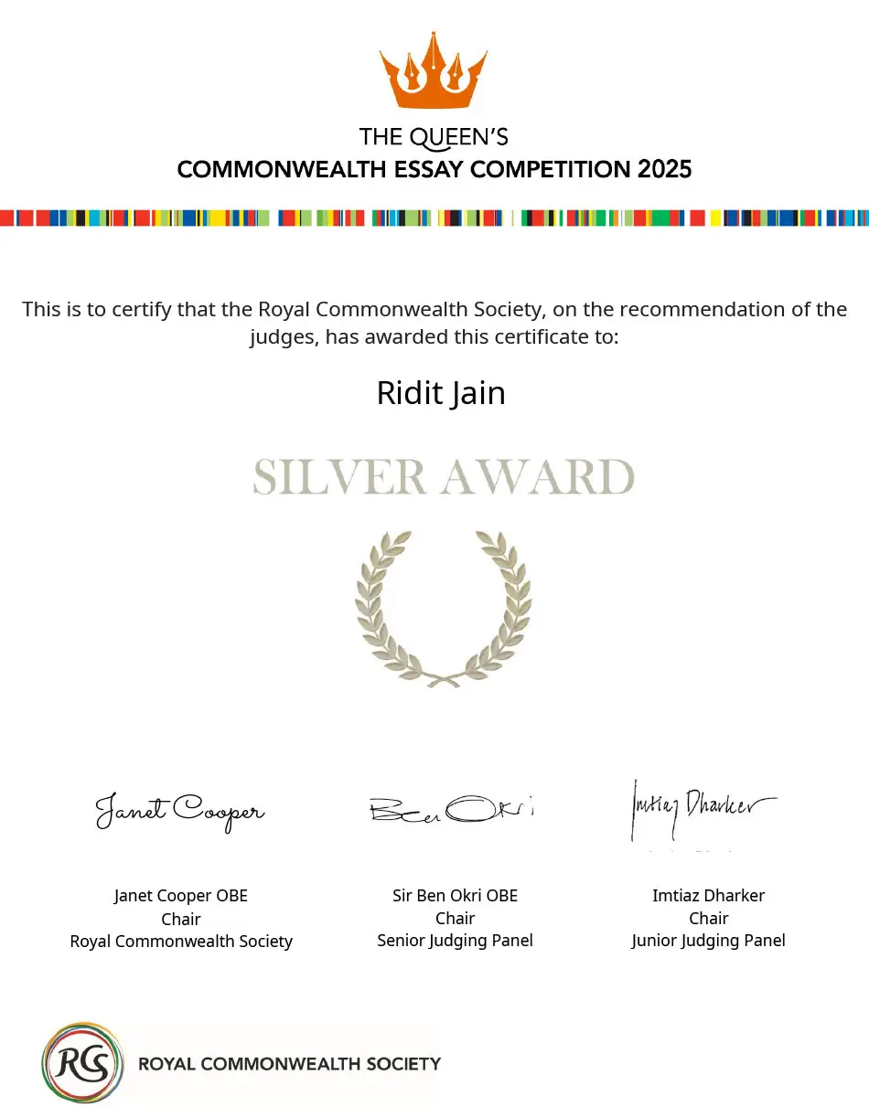 আমরা আনন্দের সাথে ঘোষণা করছি যে রিদিত জৈন এবং রিদাংশ জৈন (পঞ্চম শ্রেণি) কুইন্স কমনওয়েলথ রচনা প্রতিযোগিতা ২০২৫-এ রৌপ্য পদক পেয়েছে এবং কৃষ্ণা ভোজনগরওয়ালা (সপ্তম শ্রেণি) ব্রোঞ্জ পদক অর্জন করেছে!